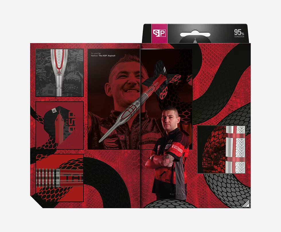 Finished with a bold red PVD coating inside the grooves for added texture and visual appeal, the set is completed with Target Pro Grip shafts, Swiss Point tips, and Aspinall Edition flights—built to meet the demands of the modern game.