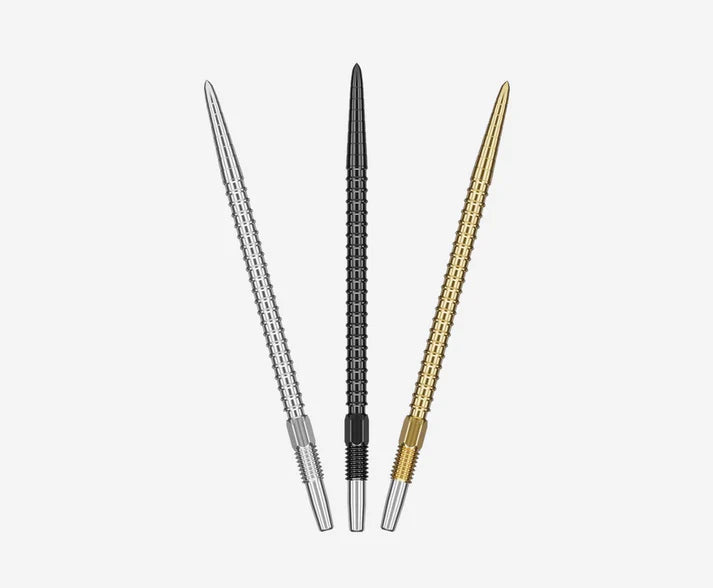 Target’s Swiss Chrono Points are designed alongside the Chrono darts, featuring precision-engineered ridges at the tip for secure dartboard entry and CNC machined grooves to enhance finger grip.